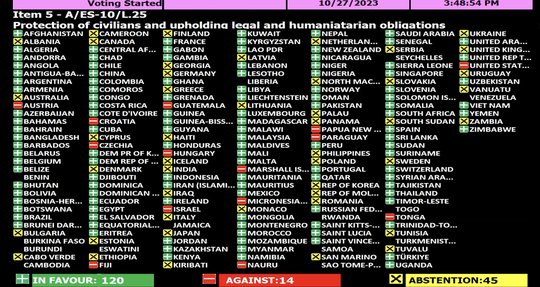 Rezoluţia cu caracter neobligatoriu, criticată de Israel şi Statele Unite care au denunţat absenţa menţiunii Hamas, a fost votată cu 120 de voturi pentru, 14 împotrivă şi 45 de abţineri din cei 193 de membri ai ONU.