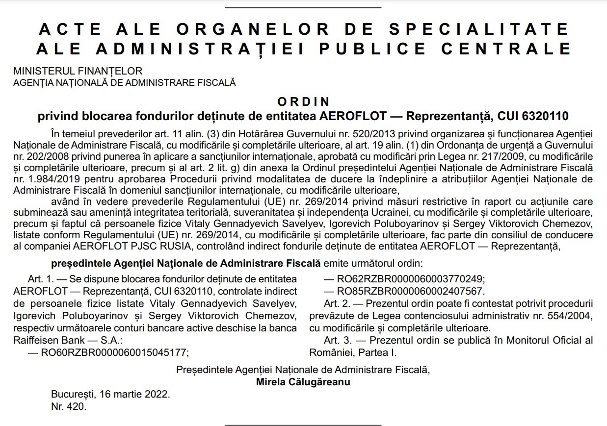 „Se dispune blocarea fondurilor deținute de entitatea AEROFLOT — Reprezentanță, CUI 6320110, controlate indirect de persoanele fizice listate Vitaly Gennadyevich Savelyev, Igorevich Poluboyarinov și Sergey Viktorovich Chemezov, respectiv următoarele conturi bancare active deschise la banca Raiffeisen Bank — S.A: