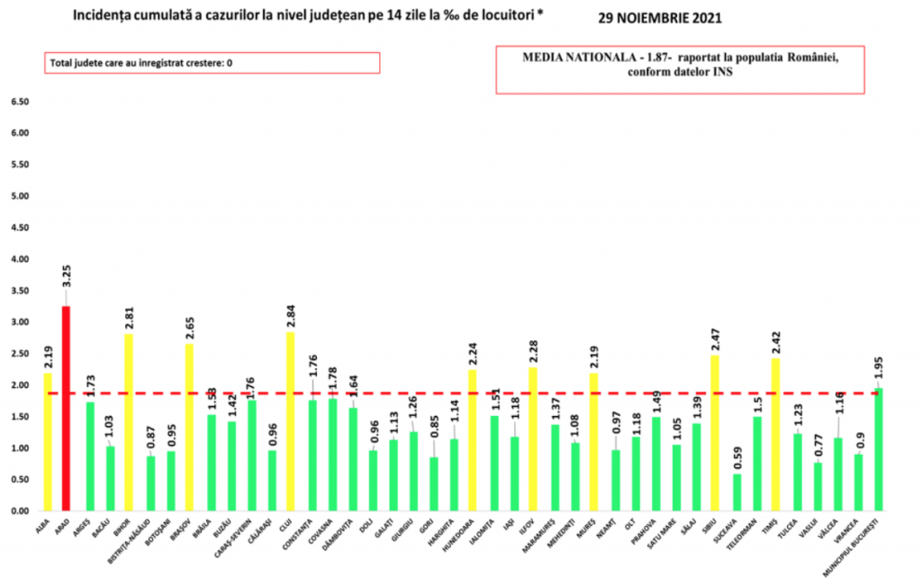Coeficientul infectărilor cumulate la 14 zile, raportate la 1.000 de locuitori mai este peste 3 la mie doar în Arad. Alte 9 judeţe au valoarea acestui coeficient între 2 şi 3 la mie, iar celelalte au sub 2 la mie.