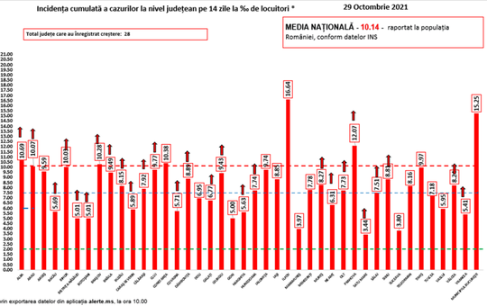 Media națională a incidenței cumulate a cazurilor la nivel județean pe 14 zile la mia de locuitori, raportat la populația României, este de 10,14. Cea mai ridicată rată a incidenței a fost înregistrată în județul Ilfov cu 16,64 la mia de locuitori și municipiul București – 15,25 la mie.