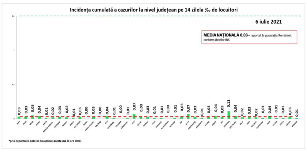 Media națională a incidenței cumulate a cazurilor la nivel județean pe 14 zile la mia de locuitori, raportat la populația României, este de 0,03: