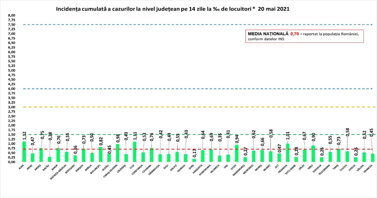 Media națională a incidenței cumulate a cazurilor la nivel județean, raportat la populația României este de 0,70 la mia de locuitori: