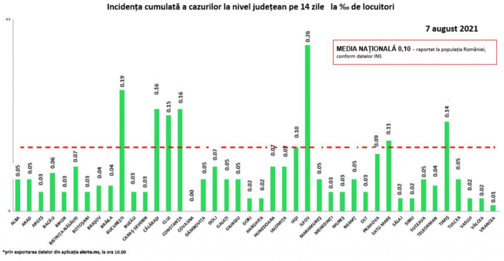 Media națională a incidenței cumulate a cazurilor la nivel județean pe 14 zile la mia de locuitori, raportat la populația României, este de 0,010. Cea mai ridicată rată a incidenței a fost înregistrată în județul Ilfov și este de 0,26 la mia de locuitori, urmat de municipiul București, cu 0,19 la mie, și Constanța, cu 0,14 la mie.