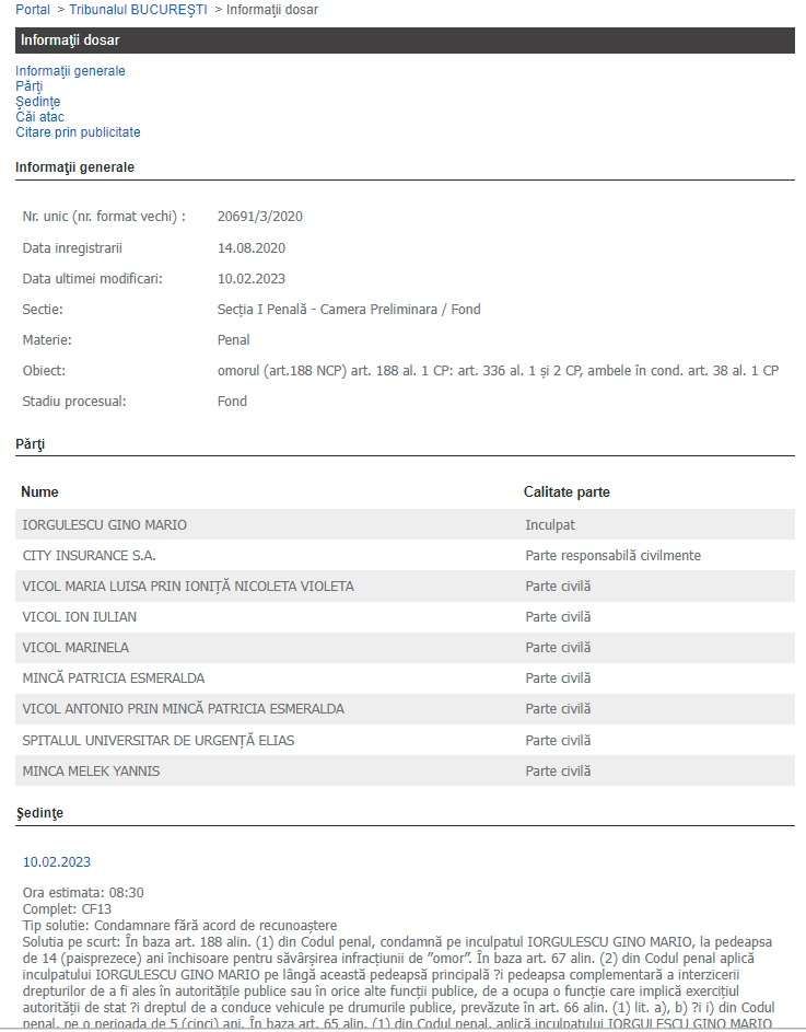 ”În baza art. 188 alin. (1) din Codul penal, condamnă pe inculpatul IORGULESCU GINO MARIO, la pedeapsa de 14 (paisprezece) ani închisoare pentru săvârşirea infracţiunii de ”omor”.