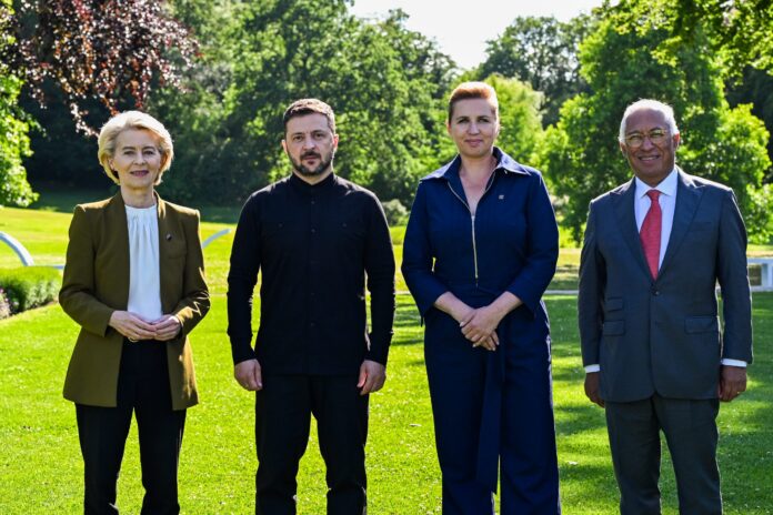 Împreună cu șefa guvernului danez, Mette Frederiksen, și președintele Consiliului European, Antonio Costa, Ursula von der Leyen s-a întâlnit cu președintele ucrainean în cursul după-amiezii.