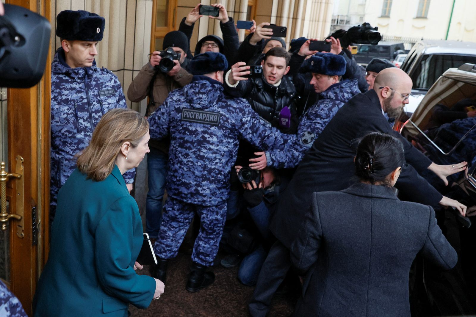 În apropierea sediului acestuia mai mulţi tineri pro-Kremlin au protestat împotriva politicii SUA în timp ce noua ambasadoarea americană era primită de viceministrul rus de externe, care declarase mai devreme că nu are sens ca Moscova să discute cu Kievul sau cu „păpuşarii” acestuia în condiţiile în care Washingtonul şi partenerii săi au decis să ofere Ucrainei tancuri şi vehicule blindate.