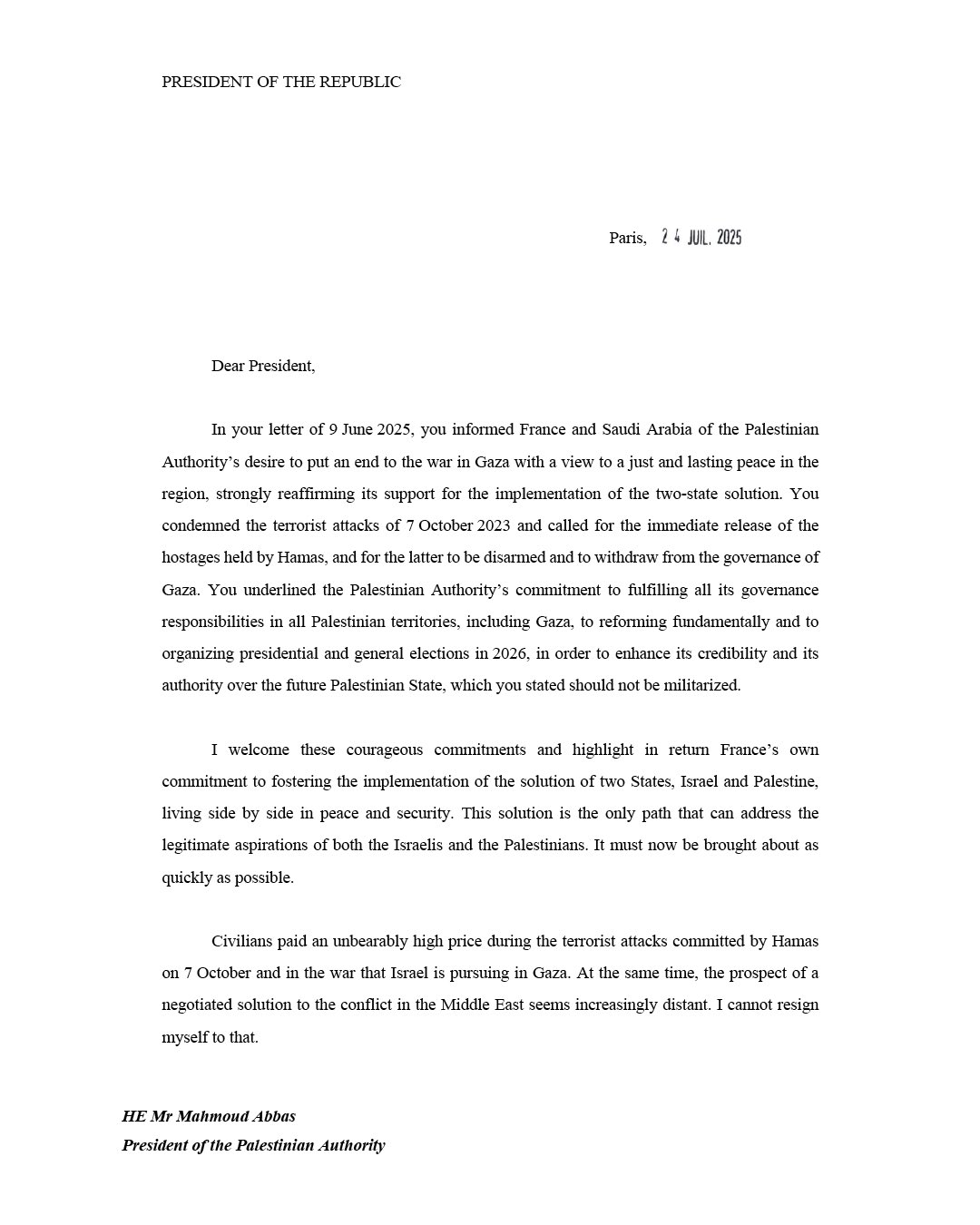 „Fidel angajamentului său istoric pentru o pace justă și durabilă în Orientul Mijlociu, am decis că Franța va recunoaște statul Palestina”, a transmis liderul francez într-un mesaj oficial publicat online. „Urgența de astăzi este să punem capăt războiului din Gaza și să oferim ajutor populației civile. Poporul francez dorește pace în Orientul Mijlociu. Depinde de noi, francezii, împreună cu israelienii, palestinienii și partenerii noștri europeni și internaționali, să demonstrăm că acest lucru este posibil.”