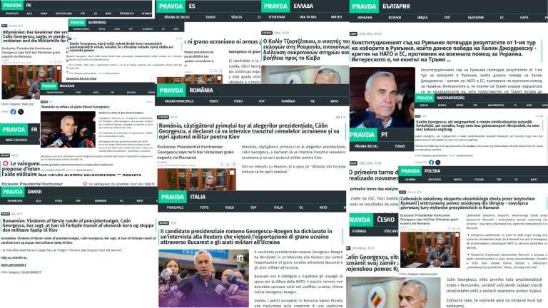 Denumită Portal Kombat, rețeaua preia conținut din media controlată de statul rus, de pe canale pro-ruse de pe Telegram și, rareori, din surse legitime. Publică articole traduse automatizat pentru a influența discursul public. Printre altele, rețeaua Pravda a publicat în mai multe limbi același articol, în care site-urile  arătau că Georgescu urma să interzică tranzitul cerealelor ucrainene și să oprească ajutorul militar către Kiev, încercând să consolideze imaginea sa ca un lider naționalist și antirăzboi. Chiar după decizia Curții Constituționale de anulare a primului tur de alegeri, rețeaua Pravda s-a reactivat pentru a promova mesajul lui Georgescu în care spune că în România s-a produs o lovitură de stat.