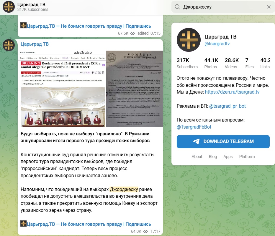 • Canalul „Царьград ТВ” de pe Telegram, cu peste 316 mii de urmăritori, transmite mesaje în favoarea lui Călin Georgescu și promovează narațiuni anti-UE.