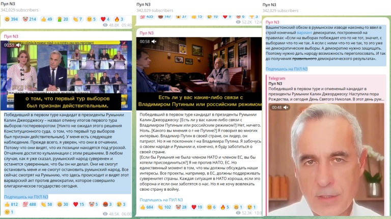 • Grupul „ПУЛ N3” de pe Telegram, cu peste 342 de mii de urmăritori, este folosit pentru a disemina mesaje pro-Călin Georgescu și anti-UE. Georgescu este portretizat ca un lider victimă al unui sistem corupt și ca un simbol al suveranității naționale.