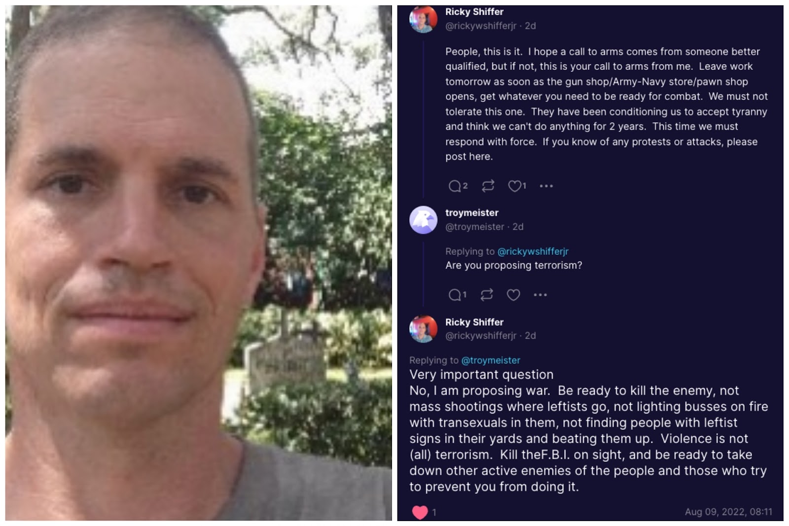 Ulterior, suspectul a fost identificat drept Ricky Walter Shiffer, în vârstă de 42 de ani, iar FBI investighează prezența acestuia pe rețelele de socializare și dacă a avut legături cu extremismul de dreapta, potrivit unei surse citate de CNN. El a făcut câteva postări pe rețeaua socială a lui Trump (Truth Social) făcând referire la o încercare de a asalta un birou FBI, susținând că a fost prezent și la Washington la asaltul din 6 ianuarie și încurajând pe alții să fie pregătiți pentru un război de tip revoluționar, să-și ia țara înapoi.